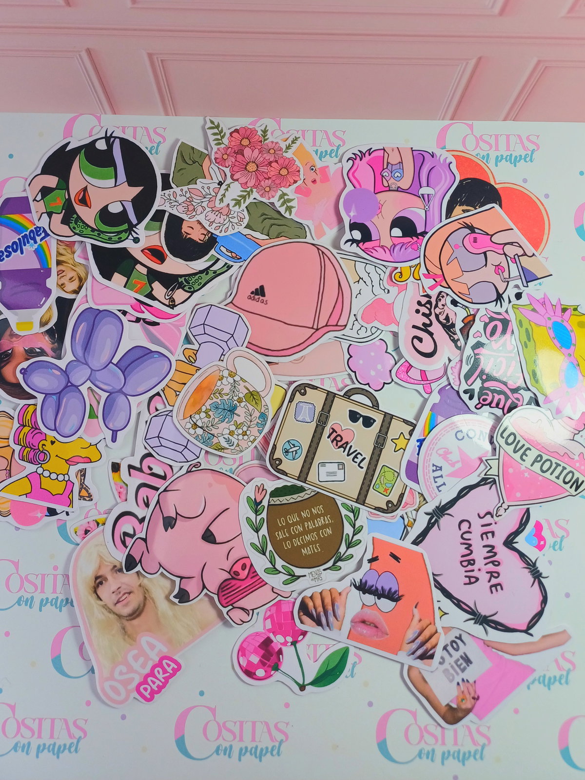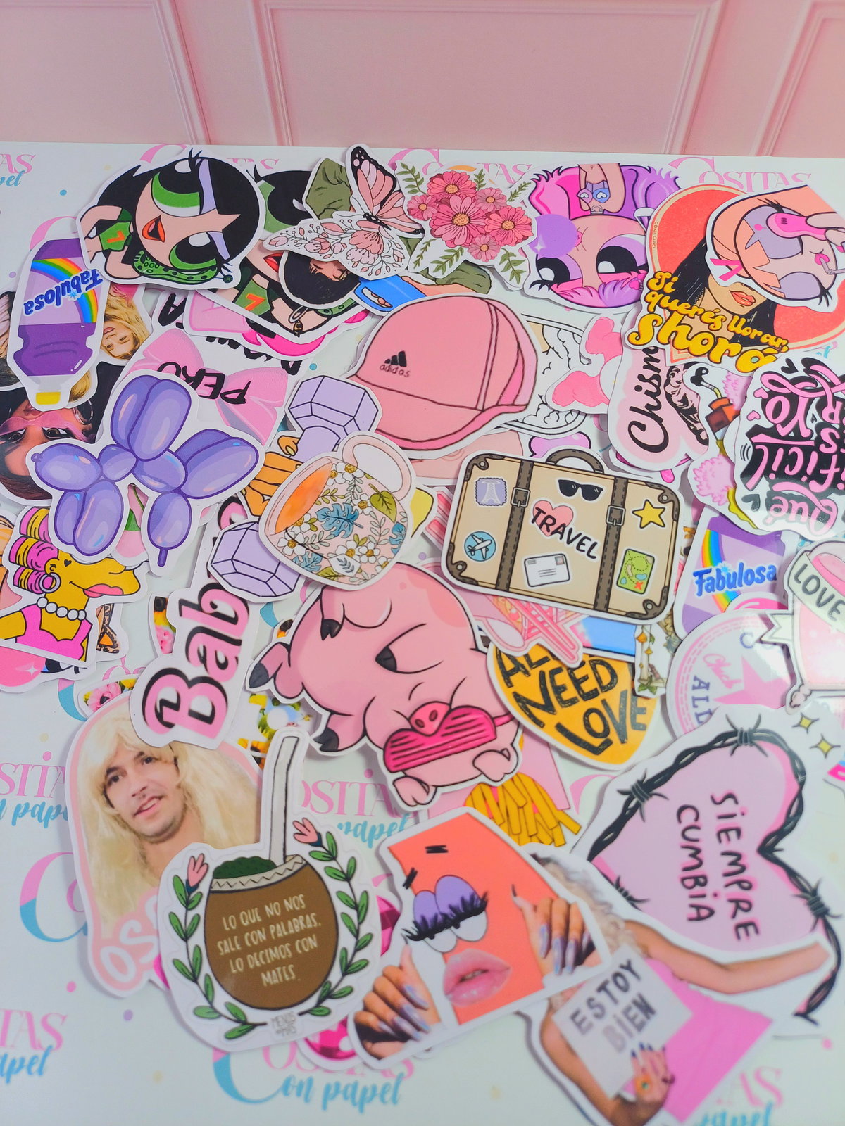 Pack de 50 stickers surtidos en tonalidades rosas (según stock, se puede coordinar algún diseño).