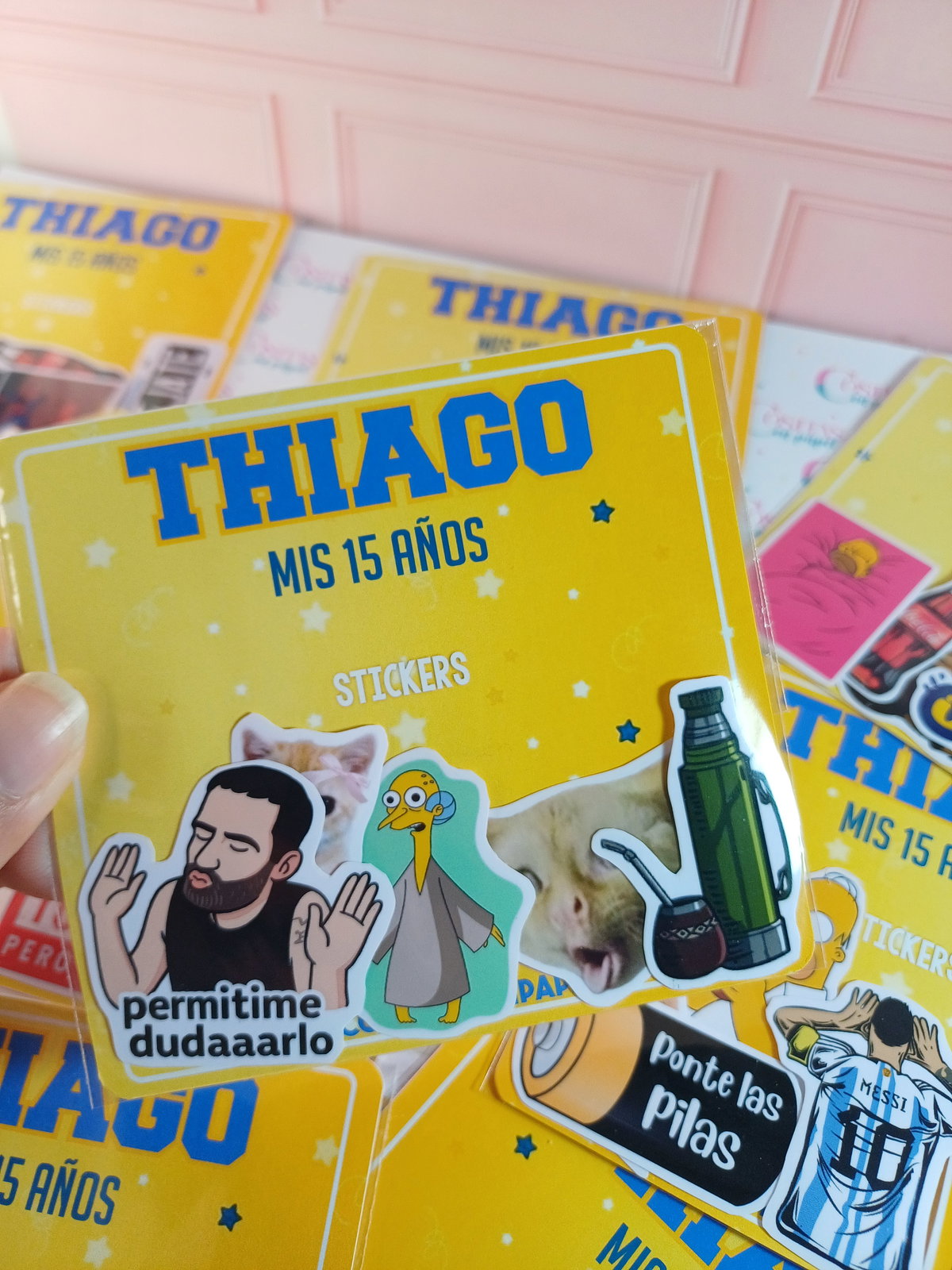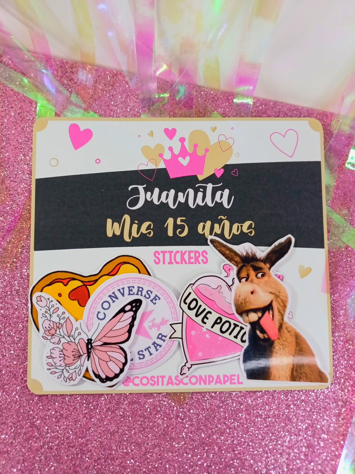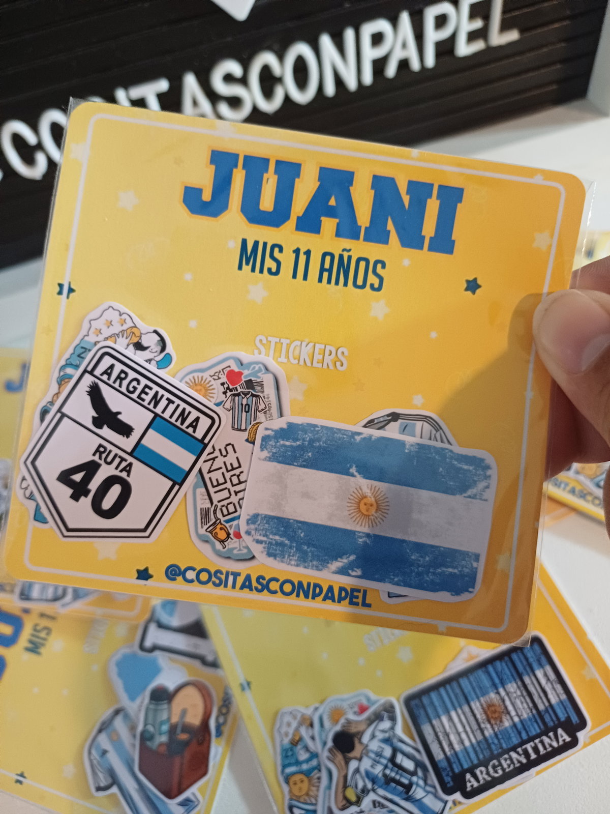 Incluye 5 stickers con tarjeta personalizada y bolsa transparente.
