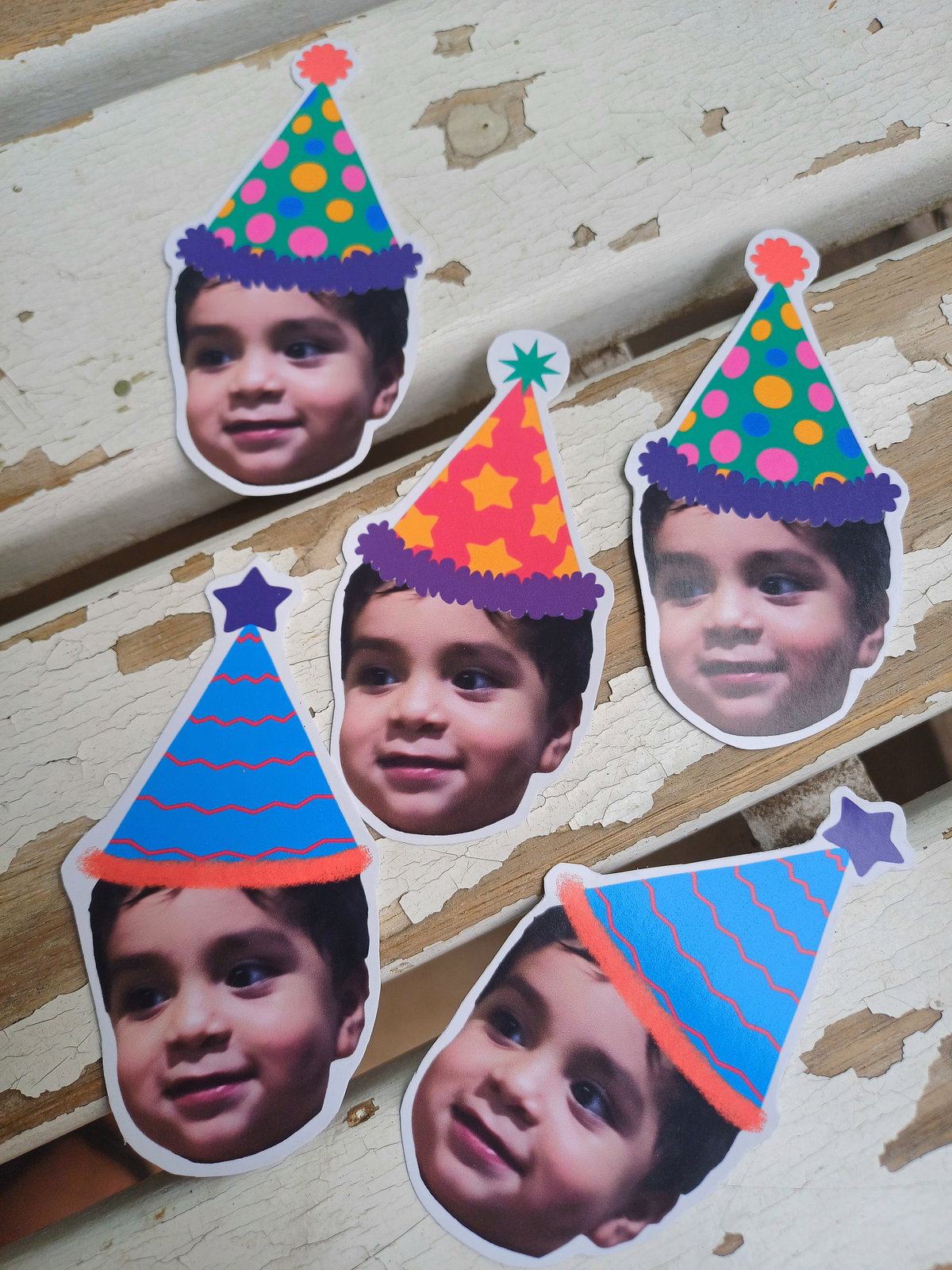 Podés mandar hasta 4 fotos y nosotros recortamos la carita y agregamos los gorritos! Tenemos variedad gorritos para elegir!
